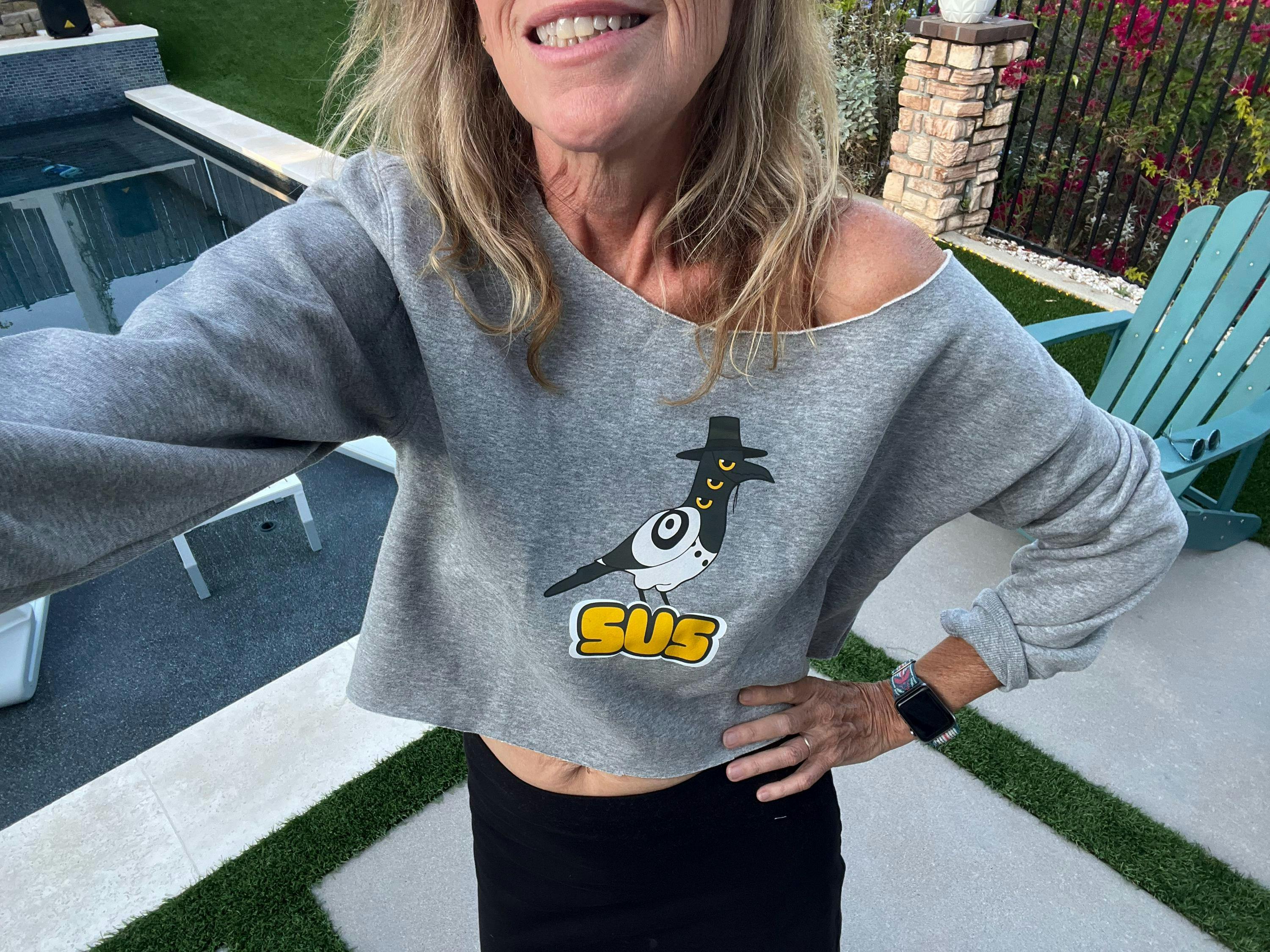 Step into the K-Pop Demon Hunters universe with this Raw Hem Crop Sweatshirt featuring the Sussie Bird design! Perfect for fans of all ages, this unique hoodie showcases the iconic Sussie Bird character with “Sus” printed beneath it, blending humor, fandom, and trendy streetwear style.